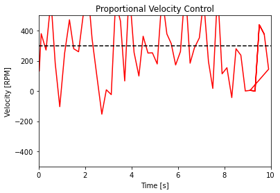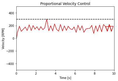 At 0.2 %/RPM, the motor averaged a speed near the target velocity of 300 RPM, shown below, which was the best I could hope for given the unsteady loading on the motor.