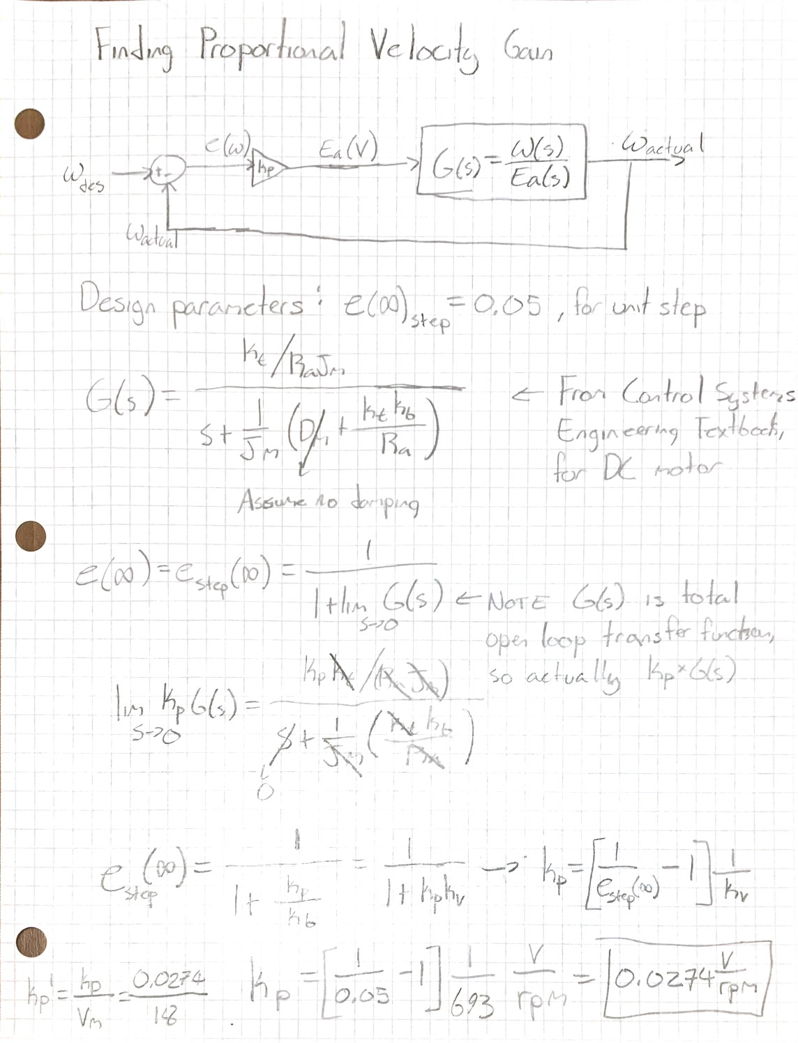 To find a starting value for Kp, I used the transfer function for a DC motor and solved for a Kp that would result in a steady state velocity error of less 5 percent. The calculations are shown in figure 1 below.