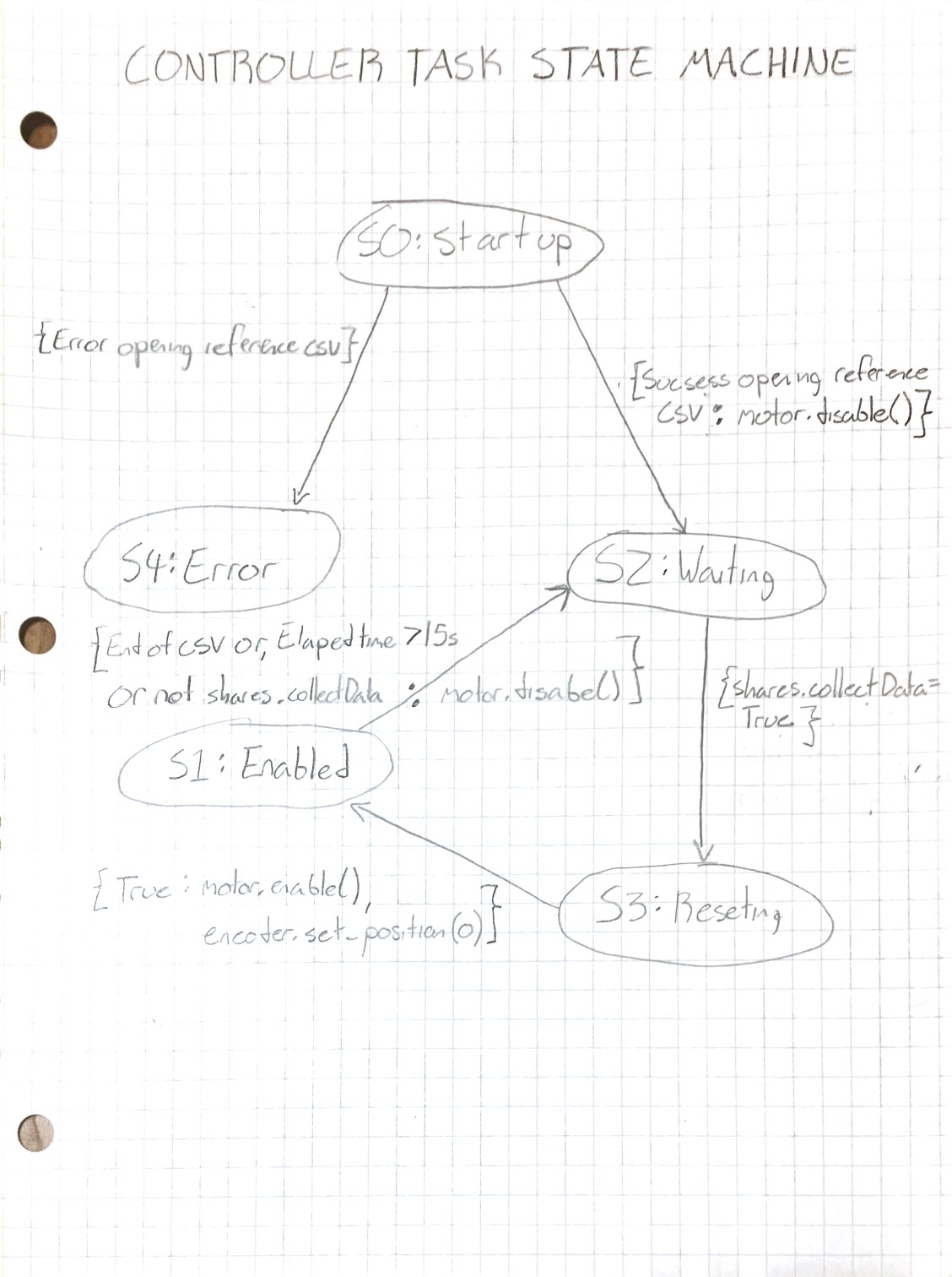 The end goal of this project was to have the motor follow a reference profile and velocity, provided as comma separated values. To achieve this goal, I created a controller task controller.Controller which uses an encoderDriver.Encoder object, pid.ClosedLoop object, and a motorDriver.Motor object to control the motor and track the reference profile. The controller task is set up as a state machine to allow for rapid execution on the single threaded Nucleo without interrupting other tasks. In normal opperation the controller switches between waiting and moving the motor along the reference profile, as shown in Figure 1 below.